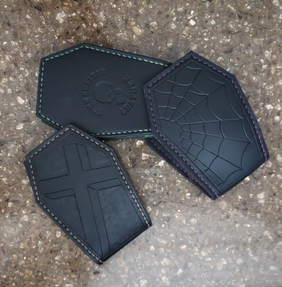 Coffin shaped flip style card holder.